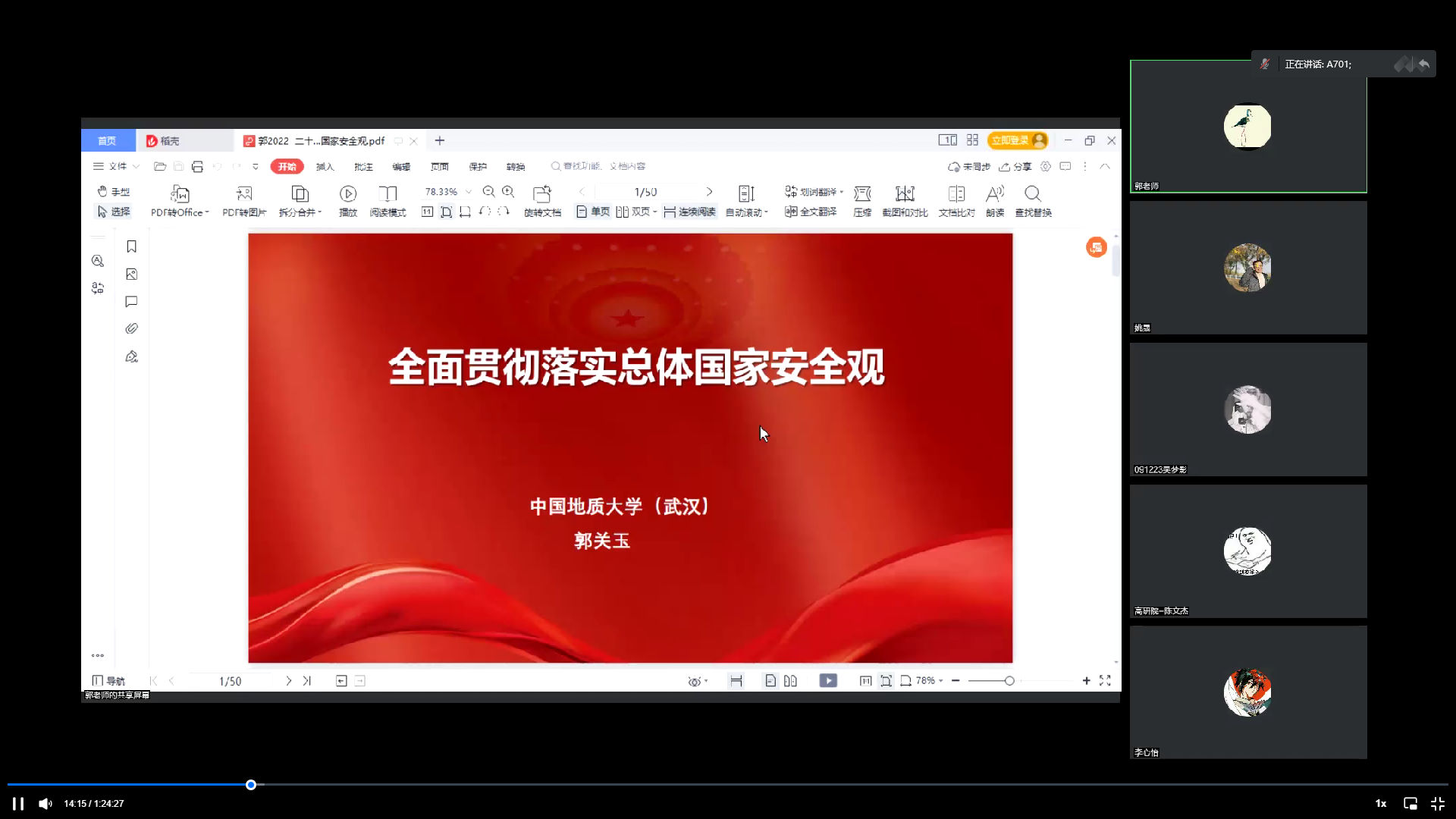 最后,郭老师介绍了关于“推进国家安全体系和能力现代化”的相关内容,从健全国家安全体系、增强维护国家安全能力、提高公共安全治理水平、完善社会治理体系、总体国家安全观的践行要求五个方面,对青年一代应该如何在自己的位置上推进国家安全体系及能力现代化进行了呼吁与号召,要求全体同学提高自身维护国家安全的责任意识,坚持国家利益至上,坚持党对国家安全的绝对领导,赢得了参会团支书的普遍认可与支持。