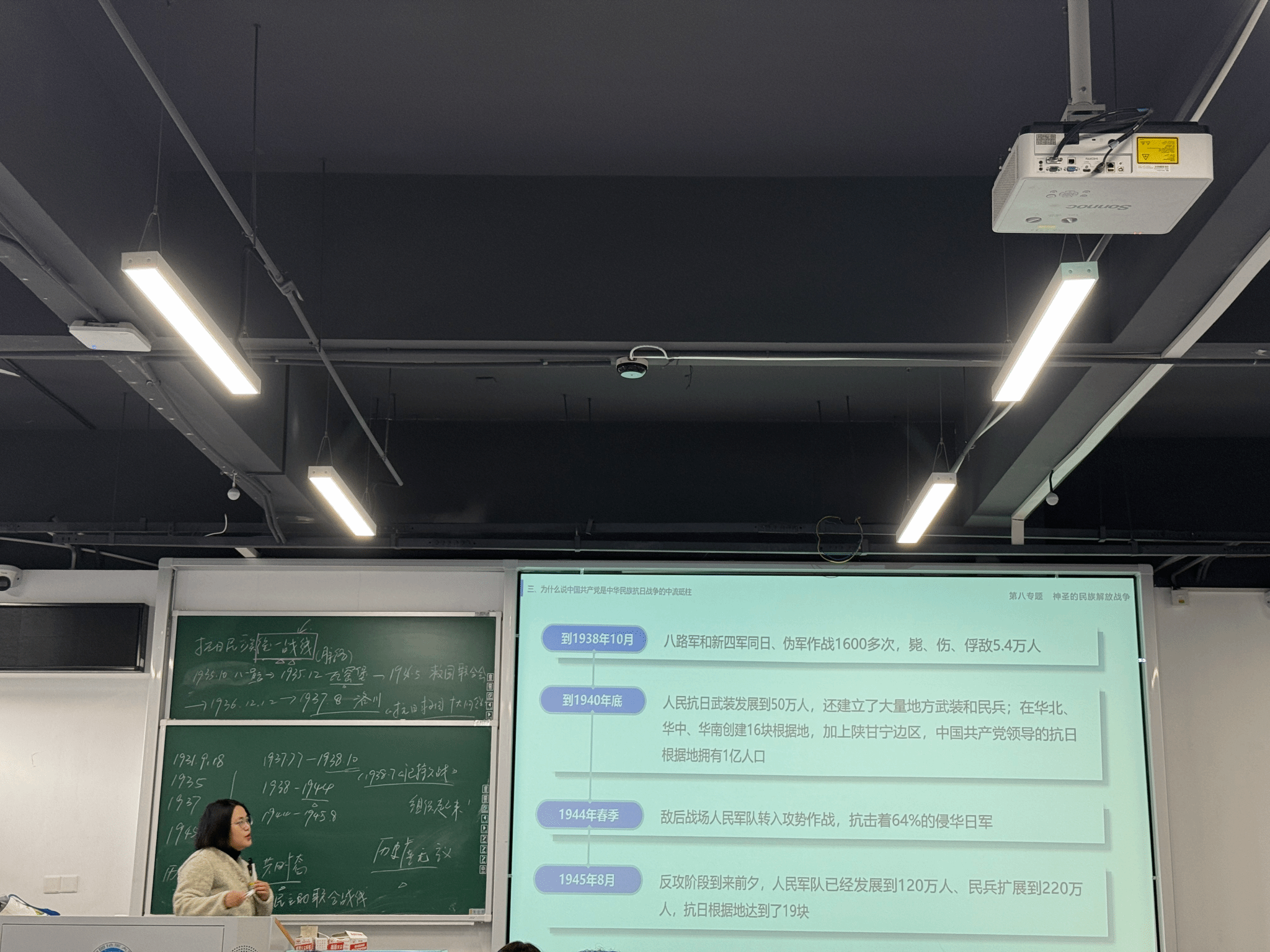 课堂上,董树婷老师因材施教,针对艺术与传媒学院学生的特点,精选《在太行山上》《南泥湾》等极具感染力的红色经典歌曲,辅之以历史案例分析、图片展示、板书设计等多样化的教学形式,生动诠释了中国共产党在中华民族抗日战争中发挥的中流砥柱作用,展现了扎实的理论功底和清晰的教学思路,为红色文化资源融入思政教育提供了鲜活范例。