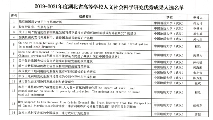 附:我校2019-2021年度湖北省高等学校人文社会科学研究优秀成果入选名单