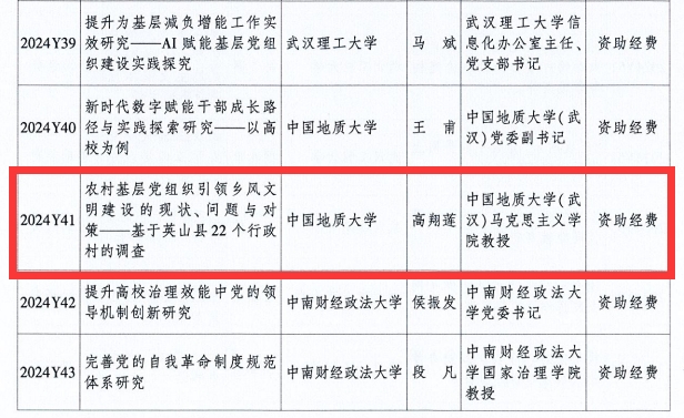 (通讯员:陈越)近日,中共湖北省委党的建设工作领导小组办公室、湖北省党的建设研究会发布《关于2024年度湖北省党的建设研究课题立项情况及有关事项的通知》,十大买球官网高翔莲教授主持申报的《农村基层党组织引领乡风文明建设的现状、间题与对策——基于英山县22个行政村的调查》成功获批专项课题立项。