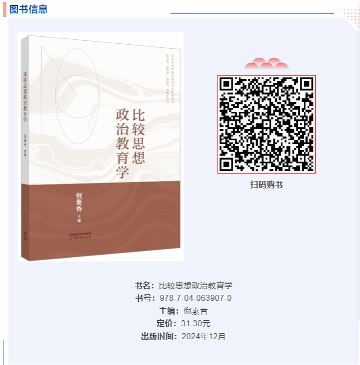 近日,由武汉大学倪素香教授主编,十大买球官网傅安洲教授等担任副主编的《比较思想政治教育学》一书由高等教育出版社出版发行。本书是新时代思想政治教育专业系列教材之一,也是高等教育出版社策划的面向思想政治教育专业本科生的系列教材之一。该书坚持以马克思主义为指导,着眼当代国内外思想政治教育发展前沿、内容编排系统全面、作者团队专业权威,具有专题性、综合性、前沿性。