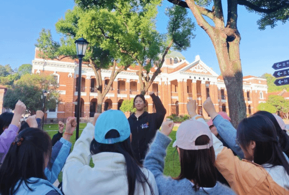 接着,在“辛亥密码破译”实践环节,团支书有序发放蕴含革命历史元素的摩斯密码线索卡,各小组破解成功后与对应标志物完成打卡合影即为胜利。