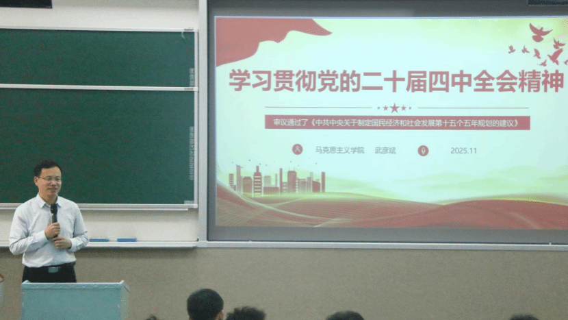 武彦斌以“学习贯彻党的二十届四中全会精神,争做新时代挺膺担当优秀学生骨干”为题宣讲党的二十届四中全会精神。他结合自身工作学习感悟,运用典型案例,带领同学们深入学习党的二十届四中全会精神,教育引导广大学生认真领会党的二十届四中全会精神,鼓励同学们以更高的站位、更饱满的热情投入团学工作,争做新时代挺膺担当的优秀学生骨干。