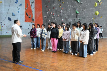 上午10:00,体能强化培训在西区攀岩馆进行。体育学院党委副书记朱军首先向同学们介绍了地大攀岩运动的历史与荣誉,并安排了8名具备专业知识与技能的体育学院学生带领学员们开展了一场妙趣横生的团建游戏。攀岩体验环节,学员们认真学习专业老师的讲解和指导,严格按照技术要领开展活动。大家彼此支持、互相打气,展现出高度的协作意识和团队精神。