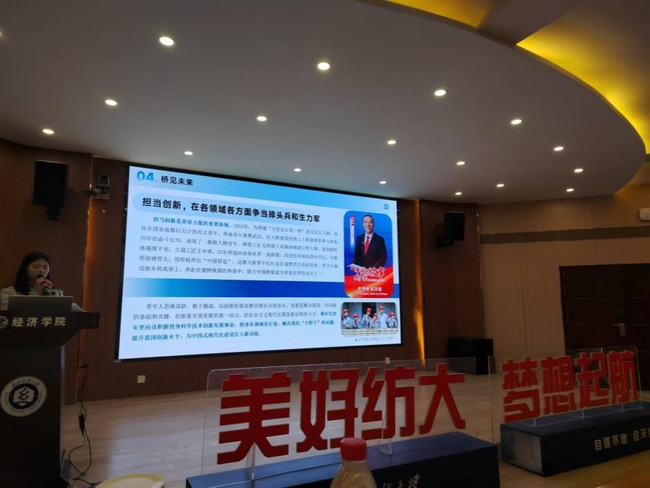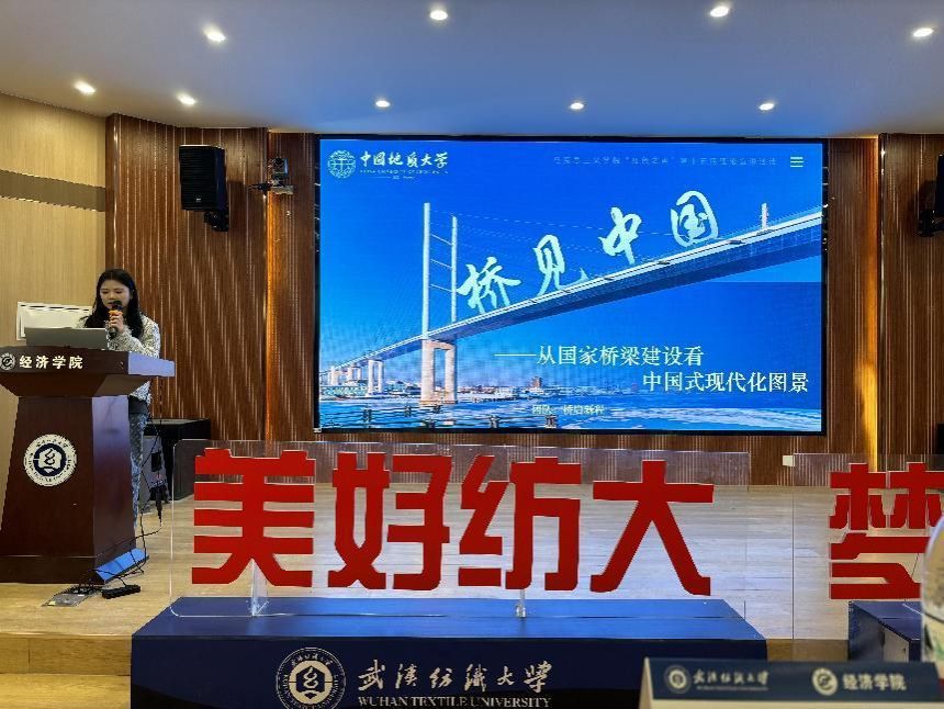 桥梁建设如同国家发展的缩影,见证了新中国从无到有、从有到优的辉煌历史。桥梁建设史也是新中国的成长史,是中国式现代化建设的生动缩影,是一张靓丽的中国名片。为深入学习和理解中国式现代化理论,十大买球的正规网站“桥启新程”宣讲团走进武汉纺织大学经济学院开展以“桥见中国——从国家桥梁建设看中国式现代化图景”为主题的线下宣讲活动。与会人员经济学院青马工程培训班学员、分团委学生会成员和院研究生会成员共200人,由“桥启新程”团队谭章洋同学担任宣讲人。