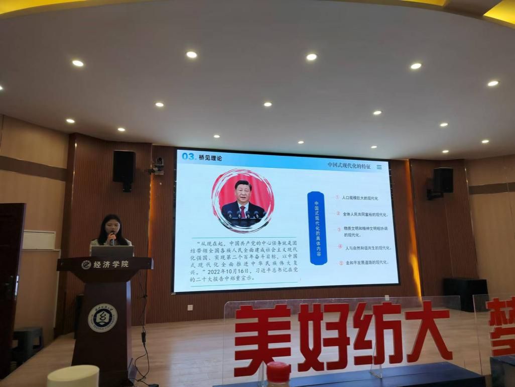 之后,谭章洋同学结合我国桥梁建设在国内外取得的成就生动展现了中国式现代化建设的生动缩影,并由此详细介绍了习近平总书记提出的中国式现代化理论的基本特征和重要意义,指出中国式现代化传承创新了中华优秀传统文化,创造了人类文明新形态和科学社会主义的崭新形态。