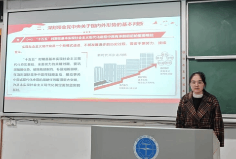 其次,蒋雅琴同学围绕“准确把握‘十五五’时期经济社会发展的指导思想、重大原则、主要目标”展开讲解,系统阐述了“十五五”时期发展的指导思想、必须遵循的“六个坚持”原则以及七个方面主要目标,引导同学们深刻理解国家发展的战略导向和总体布局,帮助同学们构建起对“十五五”发展蓝图的整体认知。