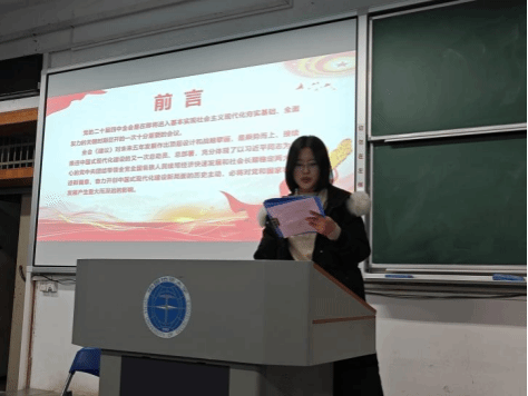随后,姬雯格同学就“准确把握‘十五五’时期经济社会发展的战略任务、重大举措和根本任务”进行讲解,重点阐述了建设现代化产业体系、加快科技自立自强、建设强大国内市场、构建高水平市场经济体制、扩大高水平对外开放、加快农业农村现代化等十二项战略任务,帮助同学们全面把握国家未来五年的重点部署与行动路径,并进一步强调坚持和加强党的全面领导是推进中国式现代化的根本保证。
