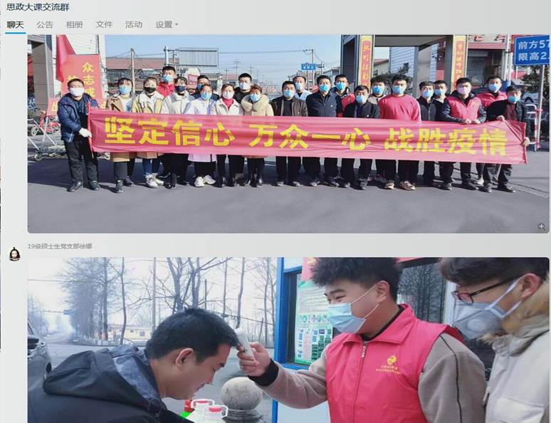 19级马克思主义理论硕士生党支部徐娜分享了她家乡的党员志愿者服务照片。她说,身边的党员们都在基层发挥着先锋模范作用,纷纷化身村庄“守护者”。卡口执勤,上门服务,组织采买等等。这些繁琐却又关键的事情,他们总是不厌其烦的坚持着。这些党员同志们冲锋在前的担当精神使她领悟到了一名优秀党员需要具备的意识和责任。中国正在以其制度的优越性、民族凝聚力在党的带领下保证着人民的生命安全。“苟利国家生死以,岂因祸福避趋之”。医生护士前线的拼搏、党员干部身先士卒的努力以及每个劳动人民的付出都是对美好家园的守护。