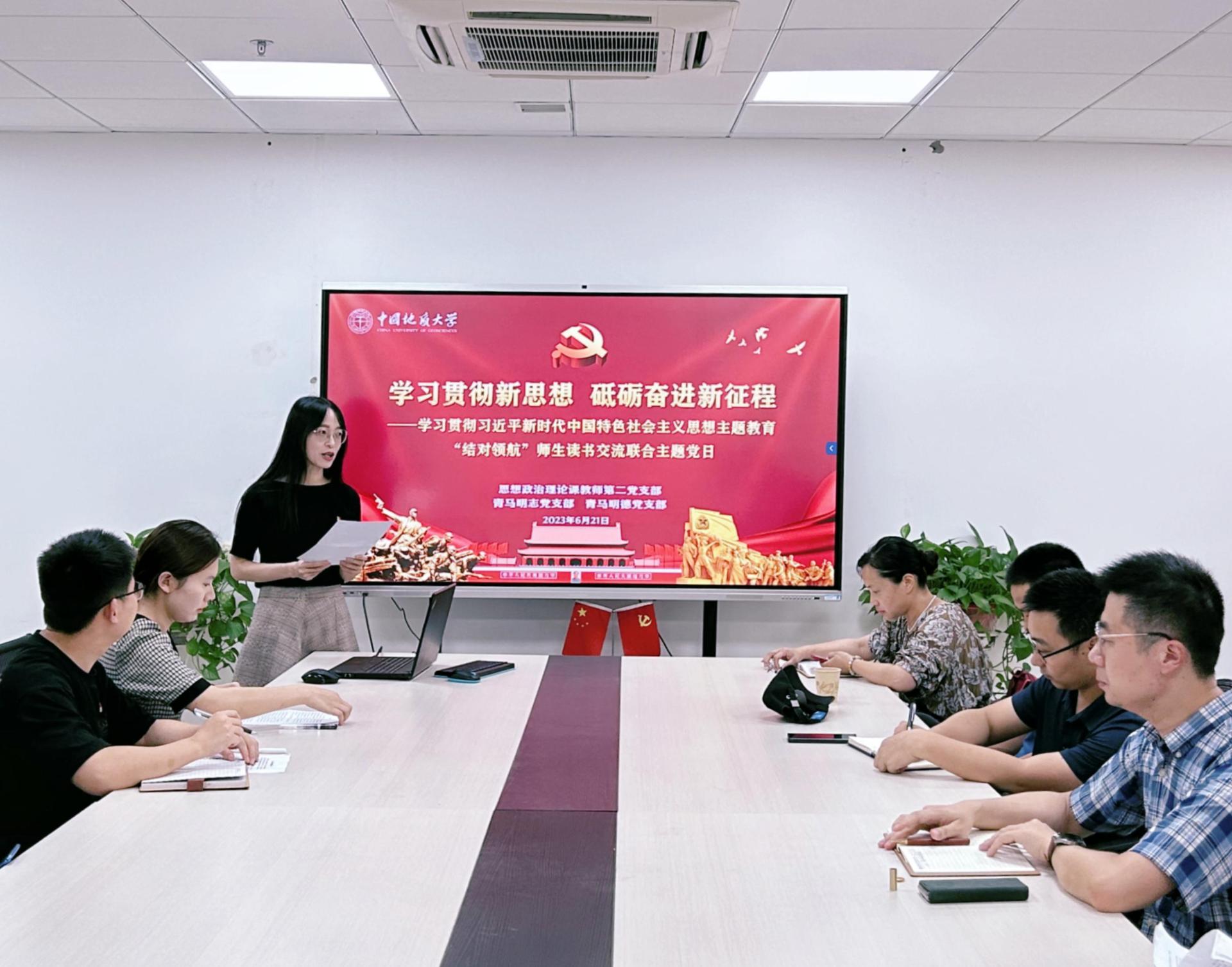 (通讯员:陈雅文、曹艺、李蔚然)2023年6月21日下午14时30分,十大买球的正规网站(武汉)十大买球的正规网站思想政治理论课教师第二党支部联合青马明志党支部、青马明德党支部在东教楼B1013会议室召开“学习贯彻新思想,砥砺奋进新征程”暨学习贯彻习近平新时代中国特色社会主义思想主题教育师生结对领航读书交流会,本次活动由党支部书记李蔚然同志和冯晓宇同志共同主持,师生党支部全体同志参与。