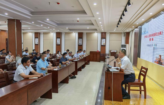 当天下午,何英教授在经济开发区会议室题为《中华人民共和国民法典》概略理论宣讲。英山县开发区管委会主任陈琼主持宣讲会。何英教授首先阐述了《民法典》被誉为“社会生活的百科全书”的重要法律地位,特别是民法典的统一性、科学性和前瞻性的法律制度创新对产业经济管理和企业家生产经营的重大意义。在介绍民法典条文编排和内容组成的基础上,结合具体案例,围绕《民法典》影响政府治理和社会发展的重点内容进行了解读。宣讲会后,专家组一行还与经济开发区管委会主要负责同志等就政府行政和企业关注的法典热点问题进行了深入交流。参加宣讲学习的成员对民法典宣讲反响热烈,认为宣讲为他们送来了精神大餐,为未来的项目建设、招商引资,服务企业、创新发展提供了非常重要的理论和实践指导支持。