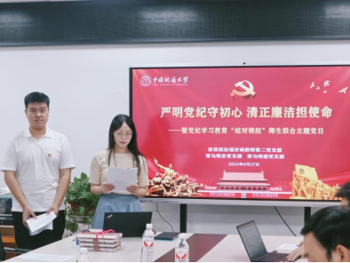 (通讯员:李蔚然,许舒婷)为深入学习领会习近平总书记关于全面加强党的纪律建设的重要论述,引导师生党员牢固树立纪律意识、法律意识和廉洁意识,推动党纪学习教育走深走实,2024年6月28日上午 10:00在东区教学综合楼B1013,马克主义学院思想政治理论课教师第二党支部、青马明志党支部和青马明德党支部全体党员共同开展“严明党纪守初心,清正廉洁担使命”为主题的师生“结对领航”共学党纪联合主题党日活动。此次主题党日活动围绕“学党纪、知党纪、明党纪、守党纪”四个环节展开,由思想政治理论课教师第二党支部书记李蔚然同志和青马明德党支部于博文同志共同主持。在场师生党员起立奏唱国歌、重温入党誓词后,活动正式开始。