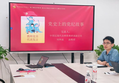 中国近代史纲要教研部副主任何帅波副教授以《党史上的党纪故事》为主题进行了交流分享,他用丰富的案例生动讲述了新民主主义革命时期中国共产党对党的纪律建设的实践与探索。他引用毛泽东同志在总结新民主主义革命胜利的宝贵经验时的著名话语,讲到我们党有三件“战胜敌人的主要武器”,第一件就是“一个有纪律的,有马克思列宁主义的理论武装的,采取自我批评方法的,联系人民群众的党”,中国共产党在求生存、图发展的过程中深刻认识到必须严明纪律以确保革命事业的顺利推进。如红军长征中“不拿群众一针一线”“损坏东西要赔偿”而深受群众拥戴,而国民党则从威望一度很高,但由于纪律涣散,进入大城市后“劫收”日伪财产,穷奢极欲、大肆挥霍,惹得民怨沸腾、民不聊生,最终导致民心尽失、一溃千里,鲜明的对比深刻反映了党的纪律建设对于提高党的凝聚力与战斗力的重要作用。