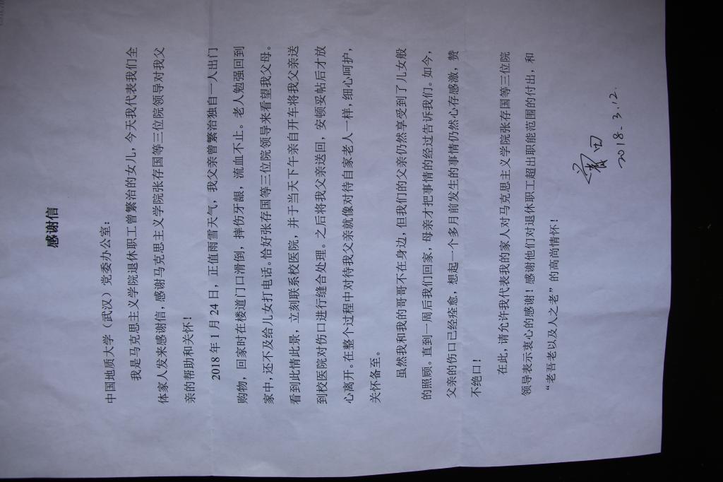 信是由十大买球官网退休职工曾繁治的女儿曾田写的。信里对十大买球官网张存国、阮一帆、严世雄等同志在2018年寒假看望离退休职工途中,遇到其父亲摔伤后立即送往医院救治表示了感谢!对学院关爱离退休教职工表示感谢!