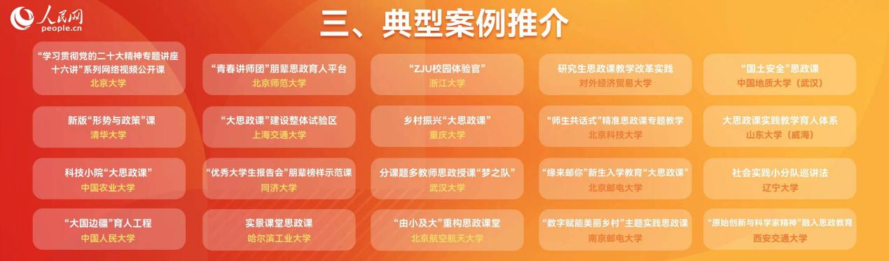 作为国家级大型年度教育论坛,人民网主办的大学校长论坛已成功举办十届,累计600余位大学书记、校长参加研讨,成为凝聚共识、助力中国高等教育改革与发展的年度盛事。《2023年高校思政课改革创新情况分析报告》根据各高校思政课程的社会反响、信息传播量、主流媒体关注度、舆论反馈情况等维度,在全国征集推介“北京大学‘学习贯彻党的二十大精神专题讲座十六讲’系列网络视频公开课”“清华大学新版‘形势与政策’课”“中国人民大学‘大国边疆’育人工程”“十大买球的正规网站‘国土安全’思政课”等20个优秀思政课程案例,以期为各高校思政课改革创新提供借鉴启示。