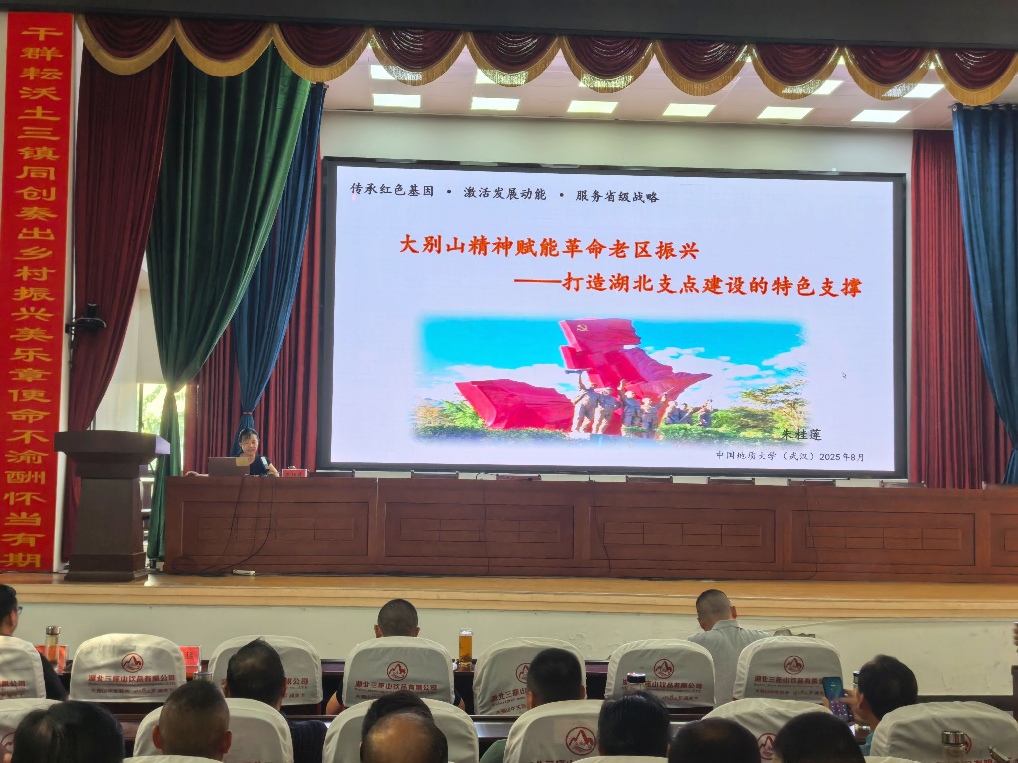 在英山县杨柳湾镇,朱桂莲副教授以《大别山精神赋能老区振兴:打造湖北支点建设的特色支撑》为题,从政策背景与时代背景出发,提出“革命老区为何需要大别山精神赋能”的时代命题,并结合大别山地区的革命历程,系统阐释了大别山精神的历史起源、核心内涵和时代价值。她认为,大别山精神不仅是宝贵的历史财富,更是大别山革命老区在新时代实现振兴发展的核心驱动力和独特优势,是服务湖北支点建设的“特色密码”,要从精神引领、文化凝聚、产业发展、生态守护、协同治理、榜样示范六个方面精准赋能革命老区振兴发展的生动实践。