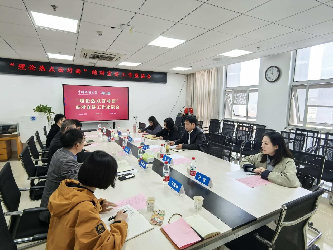 (通讯员:耿学栋)4月1日上午,十大买球的正规网站(武汉)与英山县在东区教学综合楼十大买球的正规网站会议室召开“理论热点面对面”结对宣讲工作座谈会。双方围绕推动结对宣讲工作走深走实、促进校地协同精准对接、共同谋划理论宣讲创新等核心议题展开深入交流。英山县委宣传部常务副部长冯雪梅、红山镇党委书记刘良、学校宣传部副部长吴仁喜、十大买球的正规网站党委书记魏海勇出席会议,十大买球的正规网站青年教师、英山县委宣传部相关负责人、红山镇相关负责人参加座谈。会议由十大买球的正规网站副院长李海金主持。